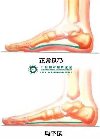 足弓过低,不明显,甚至没有足弓,会造成“扁平足”。