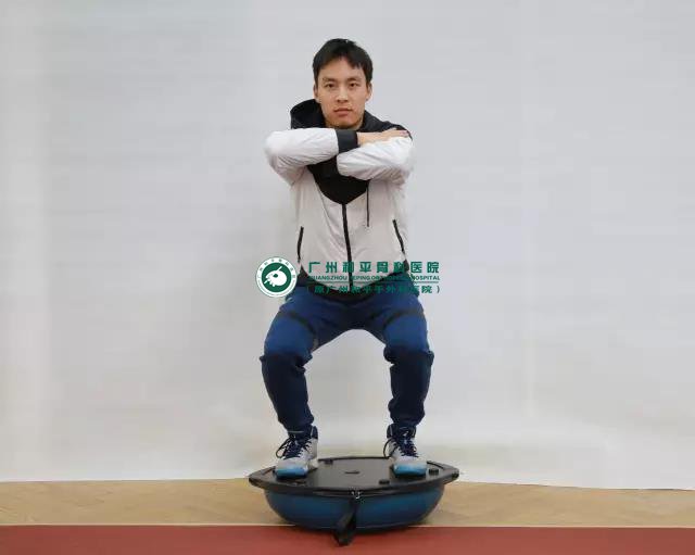 该动作有一定难度,双腿踩在BOSU球上做来回蹲起,注意臀部夹紧,膝盖方向朝向两脚第二脚趾方向,不要内扣。