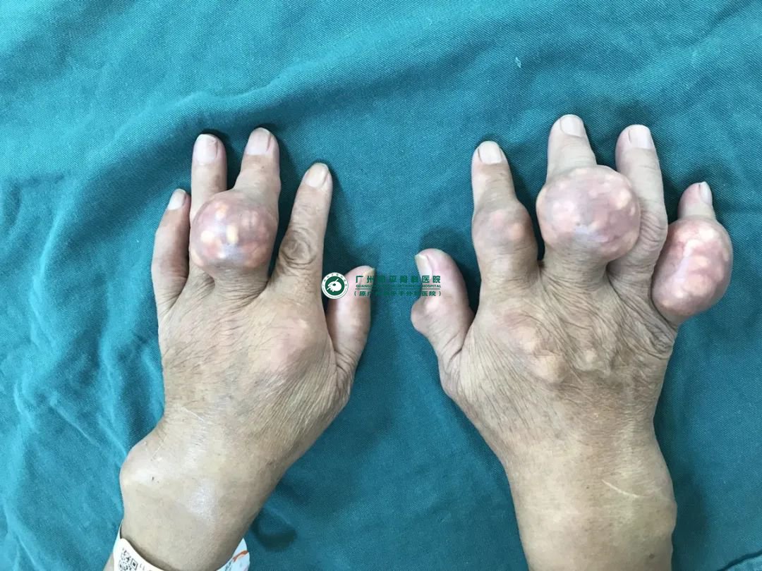 在创伤显微手足三科古欣庆主任的诊断下,发现其双手及双足多处巨大的痛风石,全身大大小小的痛风石数不胜数,突起于皮肤。痛风石宛如鸡蛋蛋黄大小,手足痛风石畸形严重,异常疼痛,甚至影响专科体格检查。当老伯听到可以诊治时,患者及家属都激动不已,仿佛寻找到救命稻草。