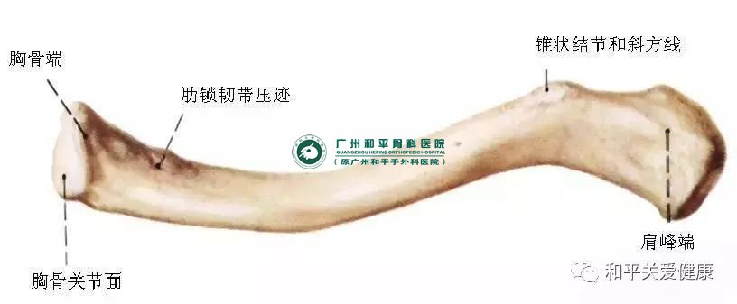全长位于皮下,近端与胸骨柄形成胸锁关节,远端与肩峰形成肩锁关节。是连接肩胛带和胸骨的独一骨性结构。