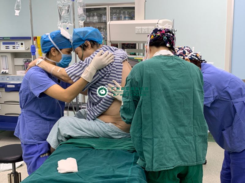赵奶奶体型偏胖弯腰不便,侧卧行椎管内麻醉很困难,为保证麻醉效果,胆大心细技高的乔钟红主治医生决定采用坐位腰穿。与侧卧位相比坐位实施腰麻具有相同的麻醉效果,更容易控制麻醉平面,血流动力学更平稳,能显著提高腰椎间隙穿刺成功率。乔主治的“坐位腰穿”话音刚落,人美心善的业务骨干周琼丽护士二话不说扎起了马步支撑着赵奶奶坐在手术床边让乔主治更好地对病人行坐位腰穿,小周护士这马步一扎将近10分钟,坐位腰穿得以顺利完成,手术医生被此场景感动,拿起手机为我们拍下了珍贵的现场影像。